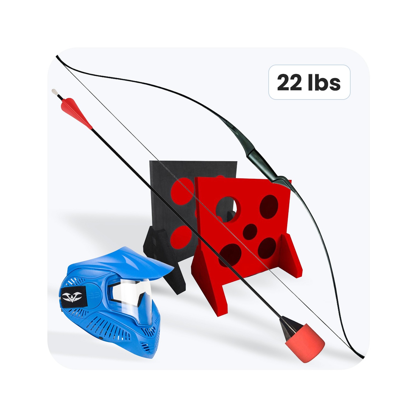 Gli archi da 22 lbs sono adatti a principianti e giocatori più esperti, offrendo precisione e fluidità. Le frecce con punta in gommapiuma, leggere e sicure, consentono partite veloci e controllate.