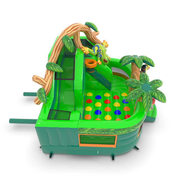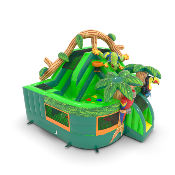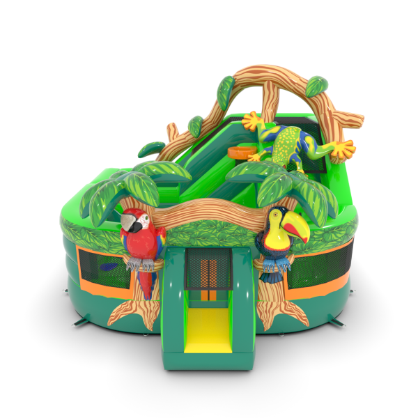 Scoprite i segreti di un'avventura selvaggia con un castello gonfiabile a tema giungla! Questa fantastica attrazione trasporta i bambini nel cuore di un paesaggio paradisiaco tropicale dove possono esplorare, saltare e divertirsi all'infinito. È il modo perfetto per attirare i bambini in un mondo di immaginazione e attività fisica, aprendo la porta ad avventure senza limiti.