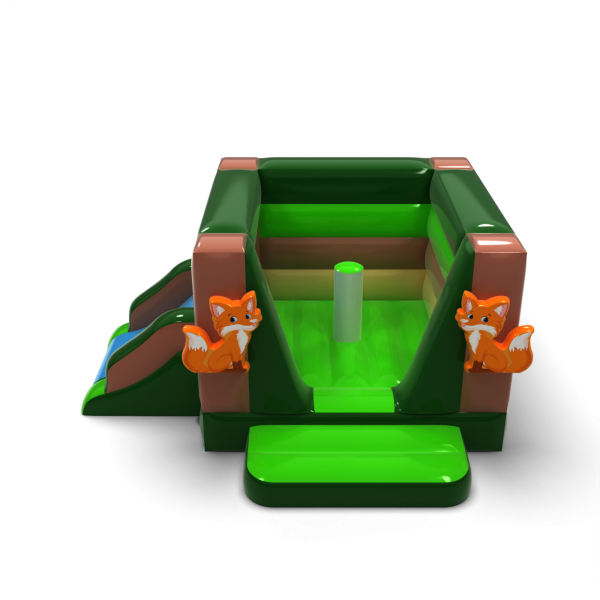 Questa versione del castello gonfiabile è stata arricchita con un piccolo scivolo, che prolunga il tempo e l'attrattiva del gioco. La combinazione di colori verde-marrone ricorda una foresta e il motivo della volpe conferisce alla struttura un aspetto amichevole. Grazie alle sue dimensioni compatte, l'unità funziona bene sia all'esterno che nelle stanze più piccole. Garantisce un punto focale moderno che può essere facilmente adattato a diversi scenari di eventi.