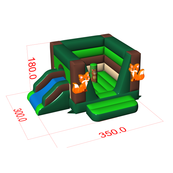 Piccolo castello gonfiabile con scivolo - a tema foresta è un'attrazione per tutti gli amanti dei rimbalzi gioiosi. I bambini si divertono un mondo, saltando e interpretando ruoli adatti al tema dell'attrazione. Il Piccolo castello gonfiabile con scivolo - a tema foresta è un'attrazione pensata non solo per i bambini più piccoli. I castelli gonfiabili di questa categoria sono solitamente decorati in modo sontuoso e contengono molti elementi che favoriscono il divertimento all'aria aperta. I castelli gonfiabili possono creare un fantastico mondo di esperienze mentre si salta gioiosamente con amici e coetanei. Il castello gonfiabile può essere combinato con altri prodotti della nostra gamma per creare un bellissimo e favoloso mondo di esperienze durante ore di allegri salti.