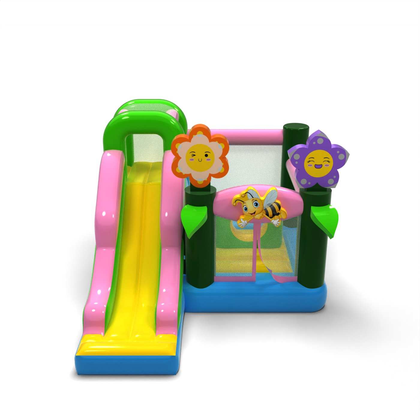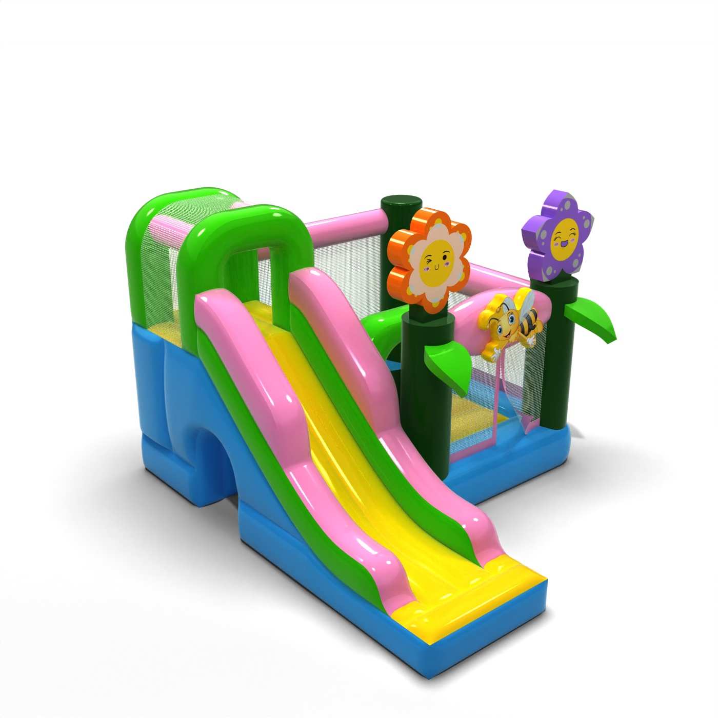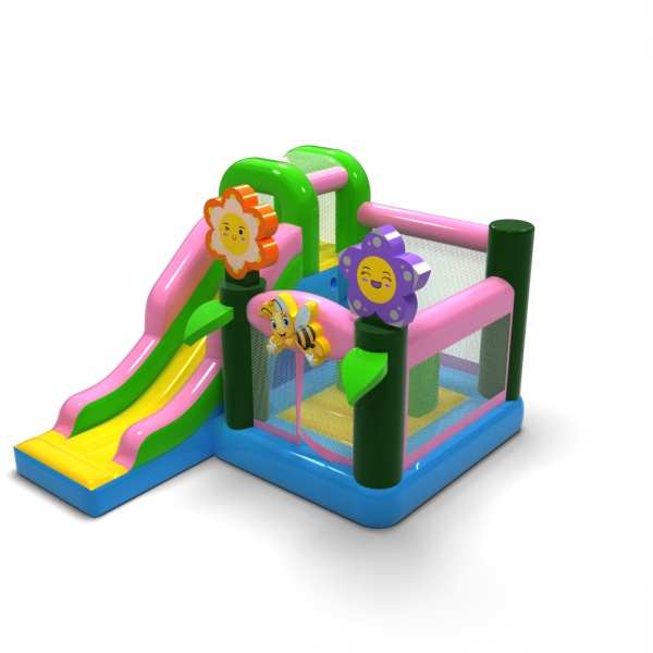 L'atmosfera primaverile e il design pastello conferiscono a questa attrazione un carattere leggero e gioioso, ideale per i più piccoli. La combinazione di rimbalzi e scivoli aggiunge varietà al divertimento e permette ai bambini di essere attivi senza essere monotoni. I motivi grafici naturali conferiscono un'atmosfera fresca e si adattano bene agli eventi all'aperto. Si tratta di un'opzione pratica per le società di noleggio che cercano un gonfiabile versatile per la stagione primavera/estate. Il modello si affermerà in occasione di festival, picnic e animazioni familiari, dove la leggerezza delle forme e un'atmosfera amichevole e divertente sono importanti.