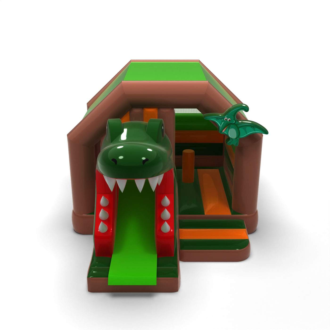 La forma della bocca aperta del dinosauro crea un effetto visivo potente e avventuroso che cattura immediatamente l'attenzione dei partecipanti all'evento. Lo scivolo guidato attraverso la bocca rafforza l'emozione del gioco e dà ai bambini la sensazione di partecipare a un'avventura giurassica. Il design distintivo e tridimensionale distingue l'attrazione dai classici scivoli e ne aumenta la riconoscibilità. Si tratta di un prodotto insolito per le società di noleggio che cercano qualcosa che differenzi realisticamente la loro offerta dai gonfiabili standard. L'attrazione è ideale per festival, eventi a tema e grandi manifestazioni all'aperto in cui la spettacolarità e il forte impatto visivo sono fondamentali.