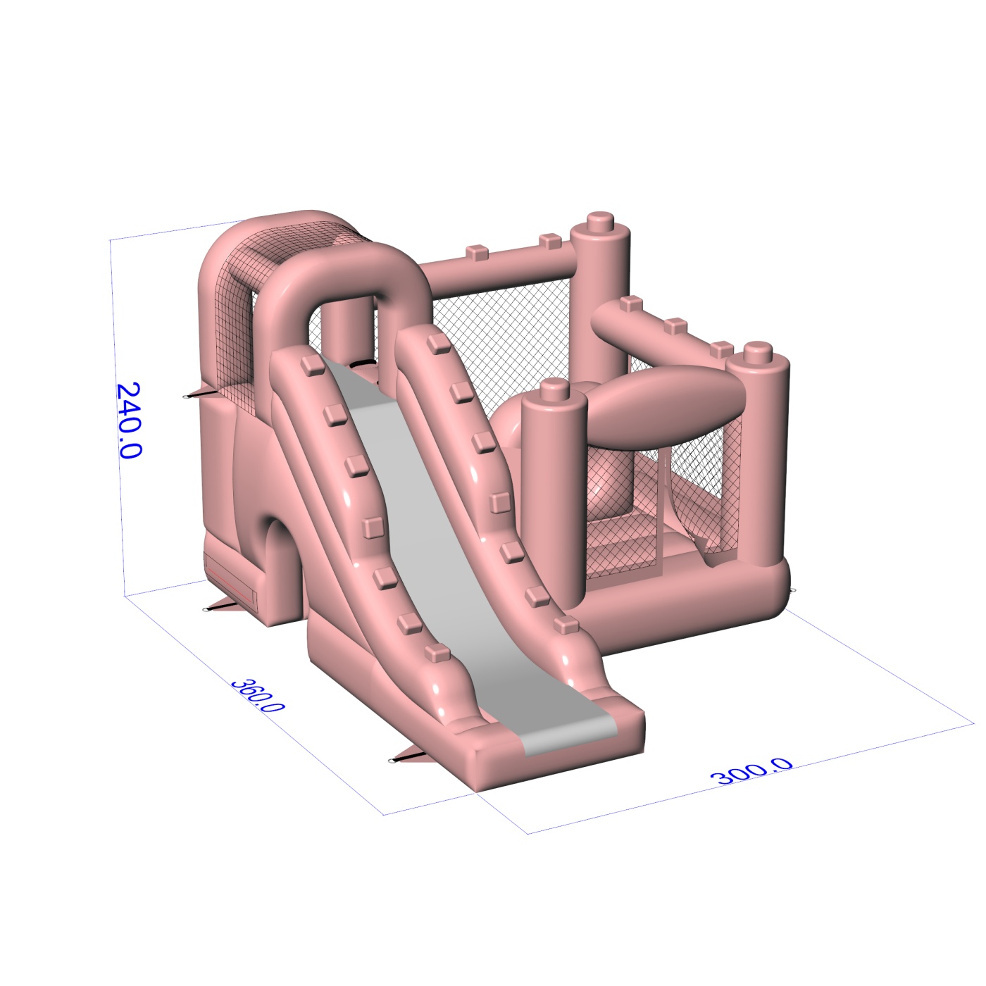 Un design compatto che combina un'area di salto e uno scivolo in un'unica unità, creando uno spazio di gioco funzionale adatto agli sviluppi più piccoli. Il colore rosa pastello conferisce all'attrazione un carattere estetico e leggero che si sposa bene con le decorazioni di palloncini e con gli allestimenti delle feste in famiglia. I lati chiusi in rete consentono un facile controllo del divertimento e aumentano il comfort dell'organizzatore. Questo modello è particolarmente pratico per il noleggio in occasione di compleanni in giardino, feste di comunione ed eventi privati intimi. L'attrazione funziona al meglio quando sono importanti l'estetica, la sicurezza e la rapidità di installazione in uno spazio limitato.