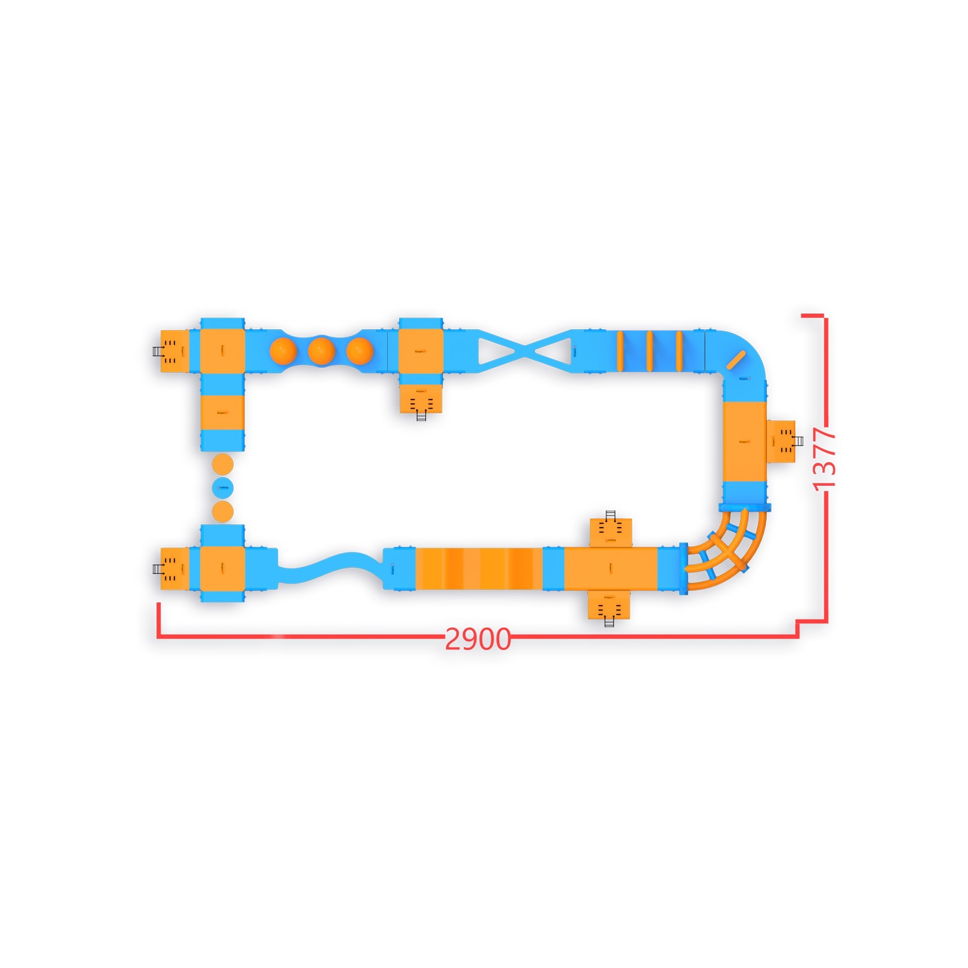 Come tutte le nostre attrazioni gonfiabili, il prodotto è realizzato con materiali di alta qualità, in questo caso PVC di nuova generazione con elevata resistenza allo strappo. È conforme allo standard di sicurezza ISO 25649-6 e, come la maggior parte delle nostre attrazioni, il gonfiabile viene fornito con una garanzia di due anni. Noi di Gangaru ci assicuriamo che i vostri pensieri siano il più possibile ridotti: nella confezione del gonfiabile forniamo un set completo di accessori necessari per collegare le attrazioni tra loro (corde). Il gonfiabile è stato controllato da un perito indipendente per verificarne la sicurezza.