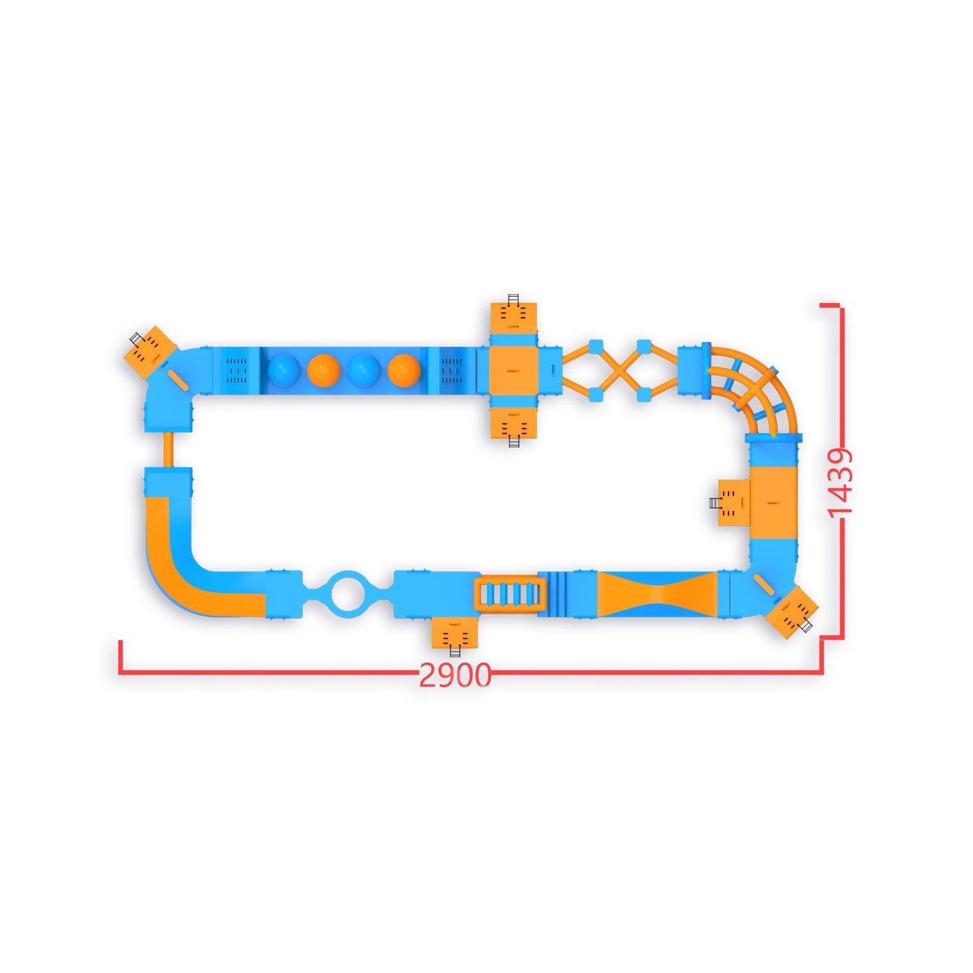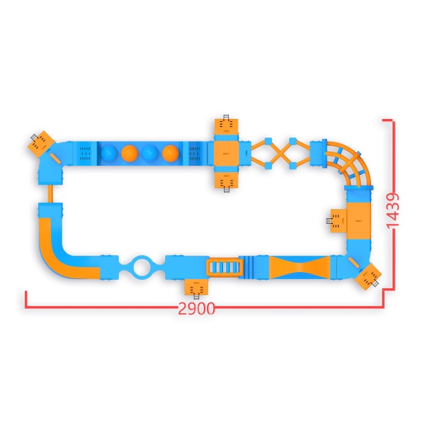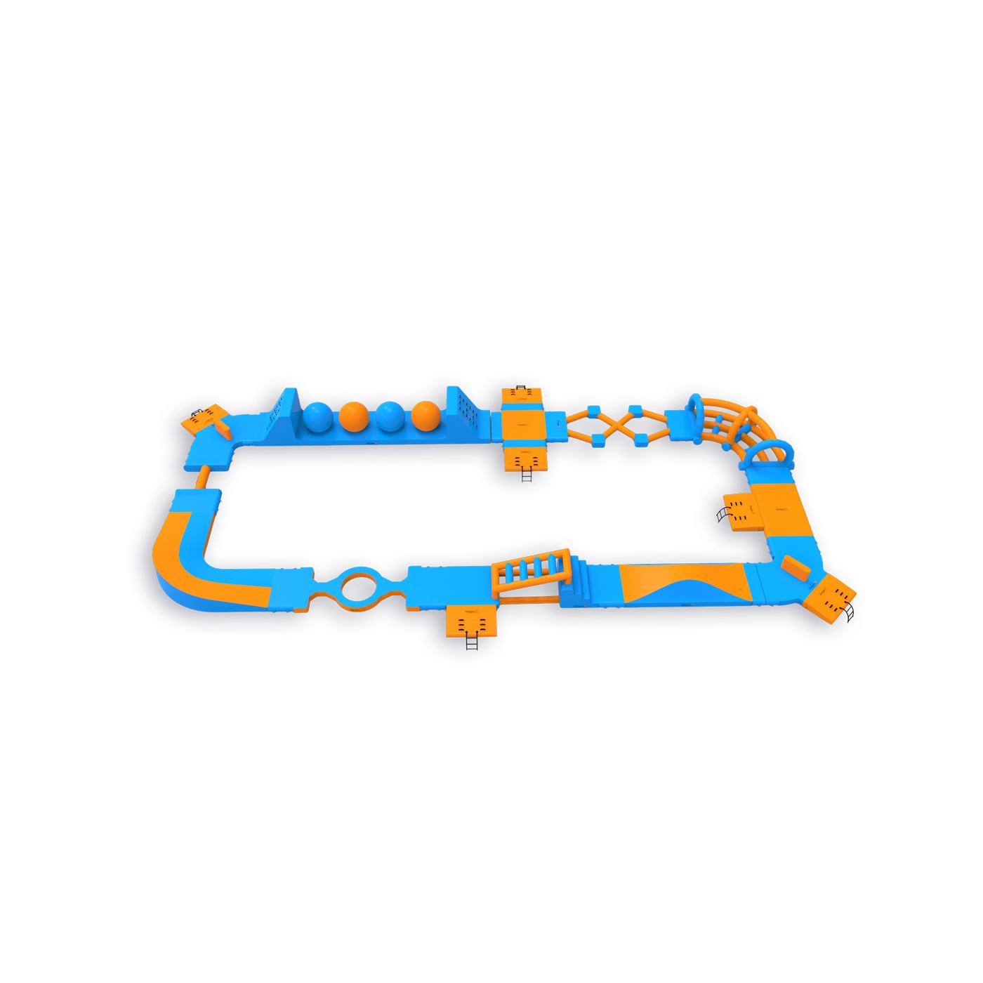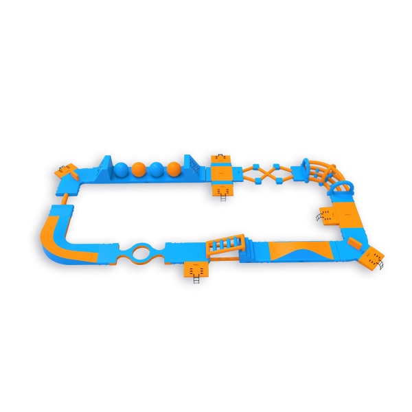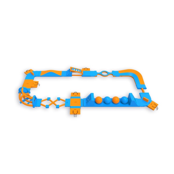 Quattro Wipeout Balls con piattaforme di salto: un elemento che mantiene i partecipanti impegnati più a lungo e incoraggia ulteriori approcci. Un layout perimetrale di 406 m² con ostacoli, scale ed elementi di equilibrio conduce attraverso zone di attività successive, fornendo un flusso naturale di gruppo fino a 40 persone alla volta. Funziona bene su specchi d'acqua di medie dimensioni, dove è importante avere attrazioni disponibili per un'ampia fascia di ospiti e un elevato turnover durante la giornata.