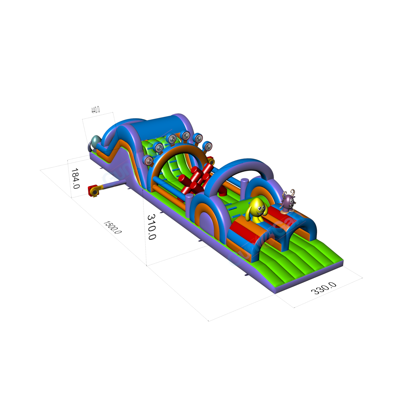 Come tutte le nostre attrazioni gonfiabili, il prodotto è realizzato con materiali di alta qualità, in questo caso PVC di nuova generazione con elevata resistenza allo strappo. Il Percorso gonfiabile ad ostacoli Mostri - 15m ha 15 m x 3,3 m x 3 m (lunghezza, larghezza e altezza). È conforme alla norma di sicurezza EN 14960 per le attrezzature da gioco gonfiabili. Consigliamo l'uso di gommoni per il gonfiabile, che aggiungiamo nel set. Come la maggior parte delle nostre attrazioni, il gonfiabile ha una garanzia di due anni. Noi di Gangaru ci assicuriamo che il vostro lavoro sia il meno gravoso possibile: forniamo un set completo di accessori necessari per il fissaggio dell'attrazione (corde, picchetti, moschettoni) nella confezione con il gonfiabile. Il gonfiabile è stato controllato per la sicurezza da un perito indipendente.
