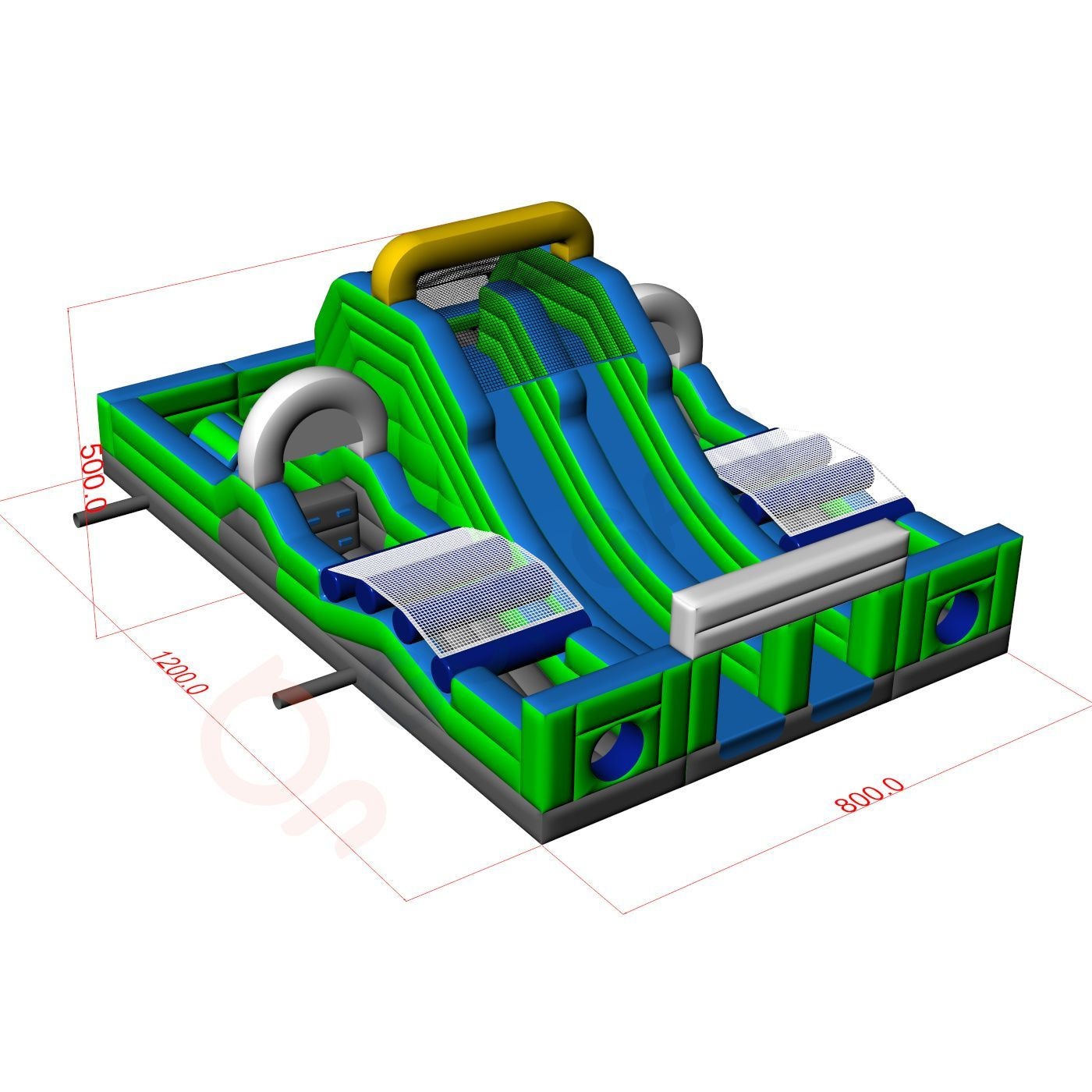 Percorso ad ostacoli gonfiabile doppio - 12 m è dedicato a tutti coloro che amano il divertimento unito alla competizione. Il percorso ad ostacoli gonfiabile è stato progettato principalmente per giovani e adulti, ma è adatto anche ai bambini a partire dai 6 anni. Quasi tutti troveranno elementi di divertimento in questa attrazione. Dedichiamo questo prodotto a tutti coloro che vogliono ritrovare il proprio spirito competitivo durante le ore di gioco all'aperto. Le attrazioni di questa serie possono includere molti elementi di varia difficoltà da superare. Arrampicarsi su una parete, scivolare velocemente e infine strisciare tra elementi sporgenti che rendono difficile completare il percorso nel minor tempo possibile.
