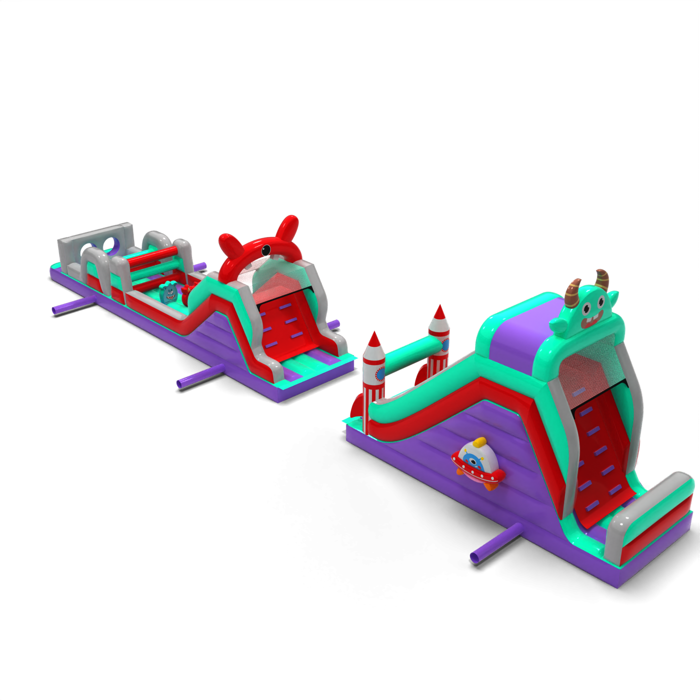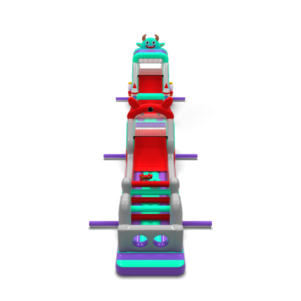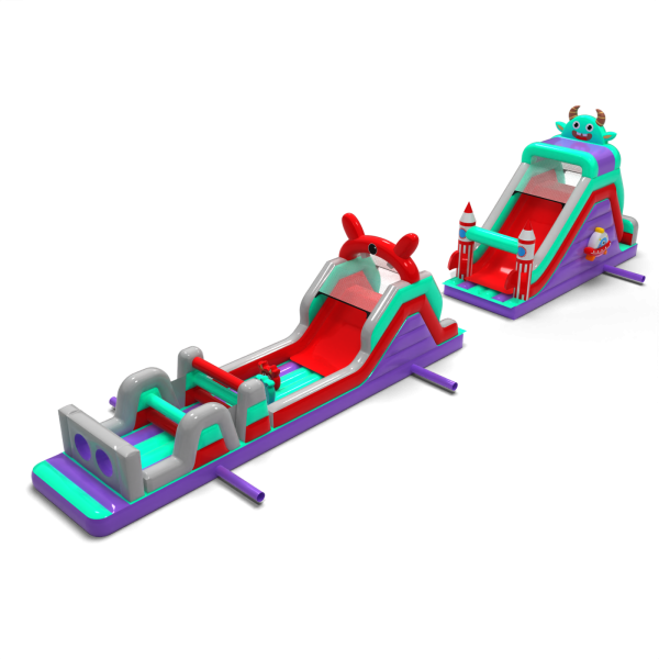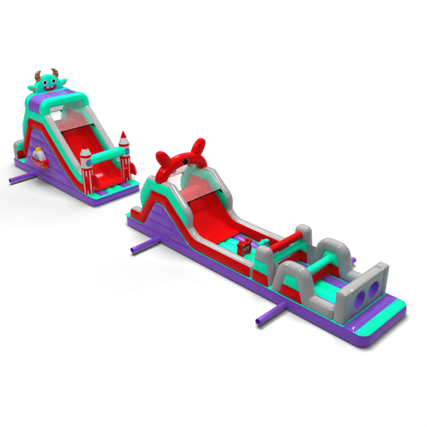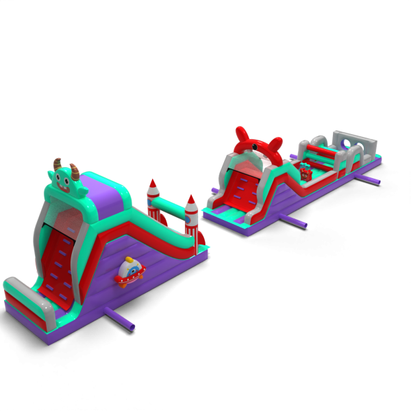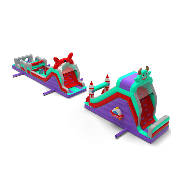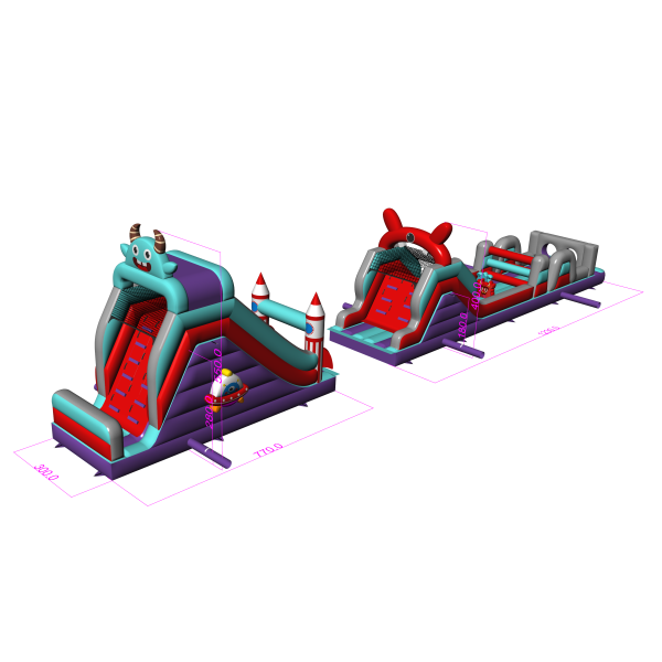 Il percorso a ostacoli di 20 metri in stile spaziale è un'attrazione ben bilanciata da utilizzare in una varietà di eventi. È composto da tre segmenti principali, tra cui una sezione a doppio scivolo e una sezione di attraversamento ostacoli. Grazie alla sua maggiore lunghezza, offre un percorso di attraversamento più lungo, consentendo ai bambini di giocare più a lungo senza dover ruotare frequentemente. Il tema grafico è mantenuto in un'estetica coerente e amichevole.