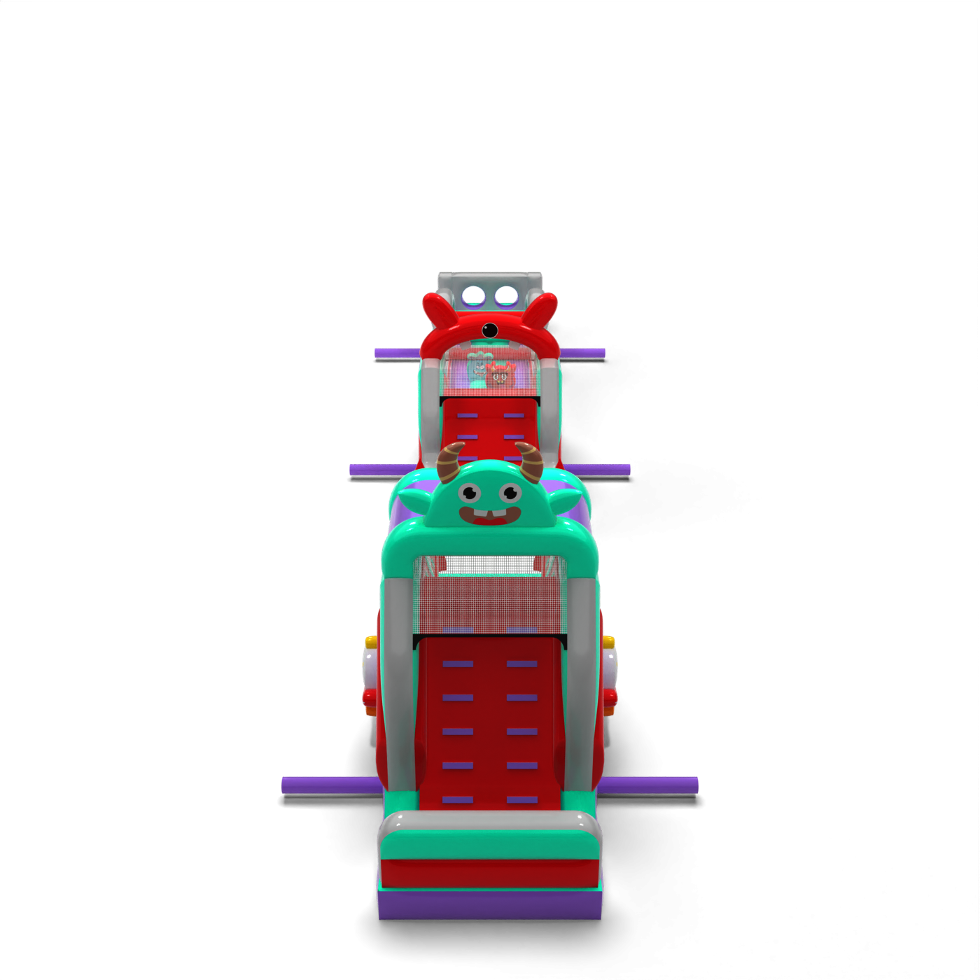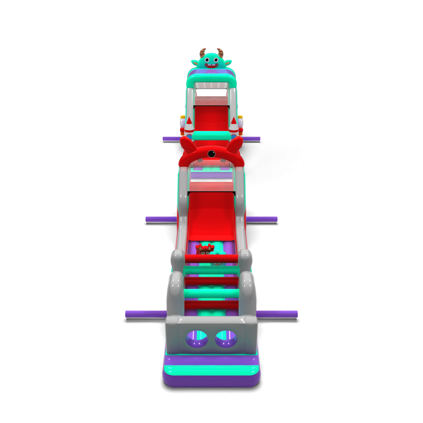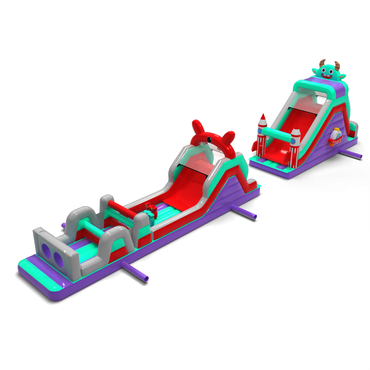 Il percorso a ostacoli di 20 metri in stile spaziale è un'attrazione ben bilanciata da utilizzare in una varietà di eventi. È composto da tre segmenti principali, tra cui una sezione a doppio scivolo e una sezione di attraversamento ostacoli. Grazie alla sua maggiore lunghezza, offre un percorso di attraversamento più lungo, consentendo ai bambini di giocare più a lungo senza dover ruotare frequentemente. Il tema grafico è mantenuto in un'estetica coerente e amichevole.